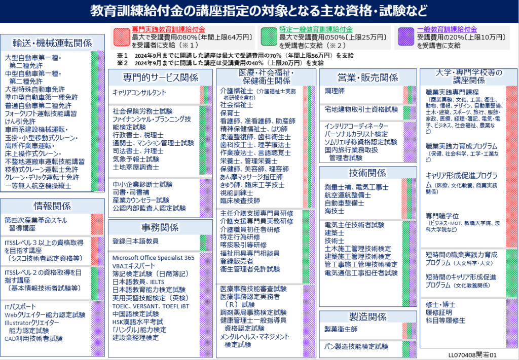 | 種類 | 雇用の安定・就職の促進になる基礎的な技術や知識を証明する資格 | 国家資格が多く、速やかな再就職・早期キャリア形成になるもの | 中長期的に訓練が必要な専門的なもの |